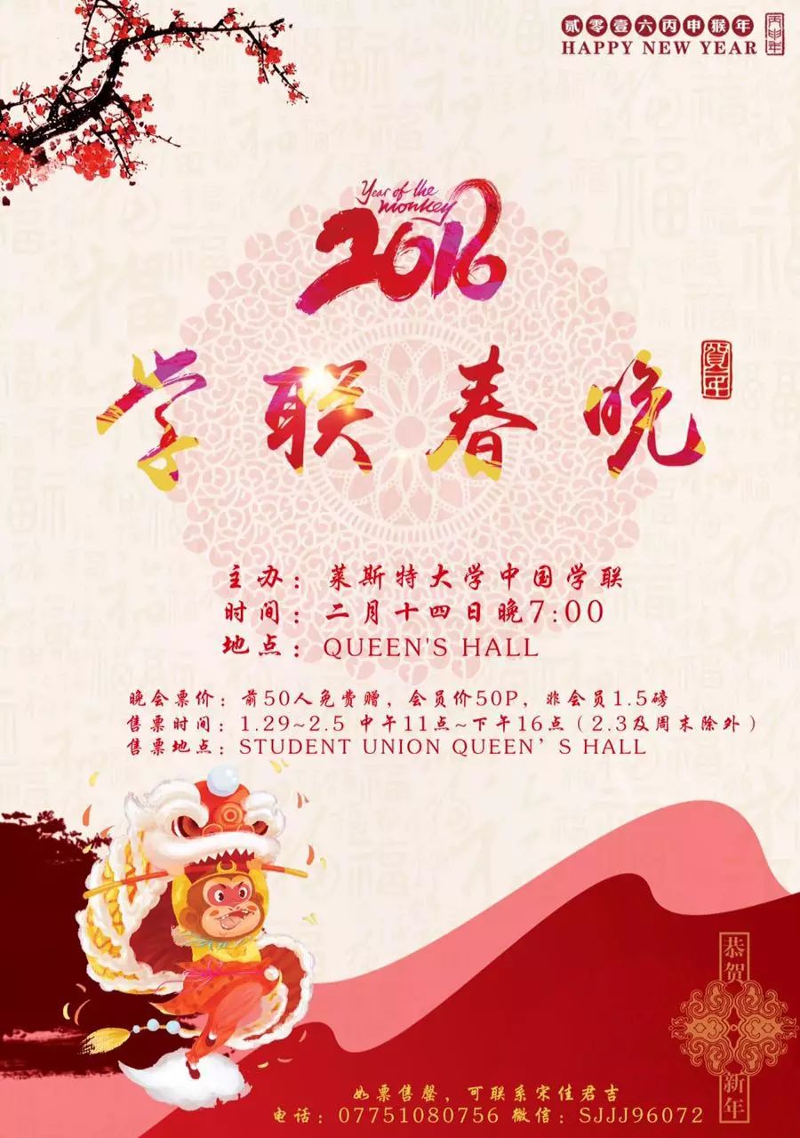还在犹豫是否会成为最耀眼的单身狗吗? Anyway 学联为大家做了完全的准备 春节情人节在即 我们推出“情侣票” 你们可以是真情侣 可以是组合,partner 无论你是男男,女女还是男女 我们不care 学联关心的是小伙伴们的心情 只要大家玩的嗨 图的就是大家开心 只要是两个人一同前往 两张票总共1镑!!! 小伙伴们还犹豫什么 学联如此贴心 so sweet !! 快来参加莱大学联举办的春晚活动吧 最重要的是 前50人免费赠票 前50人免费赠票 前50人免费赠票 这里节目更有趣 还有iphone,ipad等 更多大奖任你抽 哪些人会成为 lucky boys and lucky girls 速速来抢票!! 我们在Student Union Queen's Hall (Ken Edward Building对面)等你哟 祝大家开年鸿运,猴年大吉 活动时间:2月14日晚7点入场,表演7点30分正式开始 售票时间:1月29日-2月5日 中午11点-下午16点(2月3日及周末除外) 售票地点: Student Union Queen's Hall (Ken Edward Building 对面)